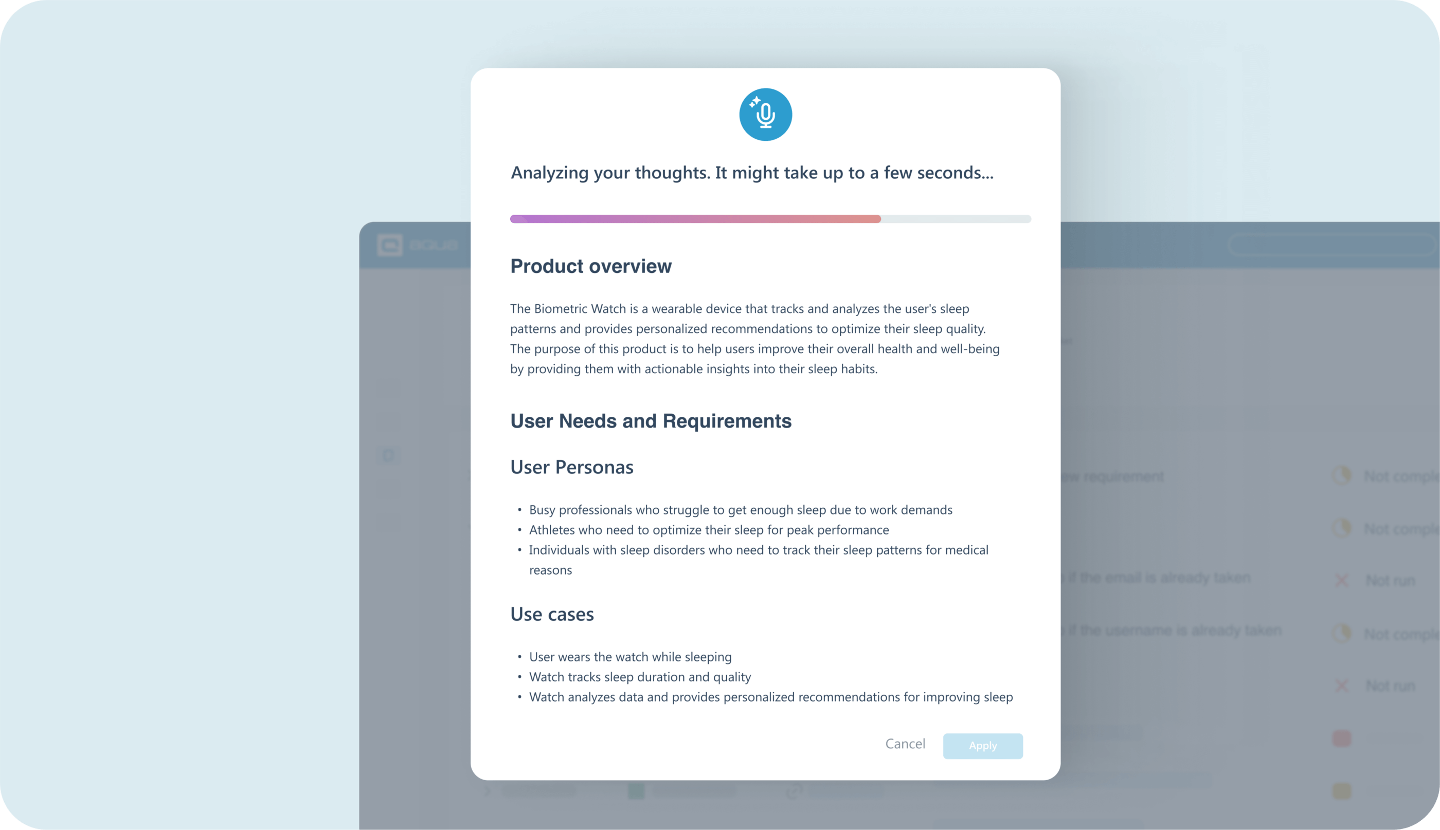 Easily translate your ideas into comprehensive documents within seconds by simply speaking or giving a few tips to AI Copilot. Whether it's a PRD, User Story, or BDD, with AI Copilot you can easily create the documents you need